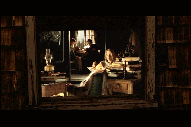 Furthermore the wood columns on the banister stretch from the top of the frame to the bottom, and fill the frame horizontally as well. The columns seem to represent the bars of a jail cell, which is emphasized by the fact that there is no way around the bars in this frame, we can't see over them or where they begin or end. This "prison-cell" symbolism could illustrate that father is guilty, and feels trapped by his guilt under the condemning eye of god; which could be supported if Father's look in the following shot is interpreted as one of guilt. The prison-cell metaphor could also symbolize Father's disconnection from god; if he is evil and has "stepped away from god" as sister Aloysius suggests, then he has lost touch with god, which is supported by his sermon about feeling lost and in doubt at the beginning of the film. The shot could also be interpreted as father feeling the same way but about something he has done at a past parish, rather than abuse.